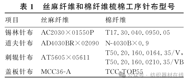 依据丝麻纤维特性,优选梳棉机针布类型。如:选用AC2030×01550P型小总高、小作业角锡林针布齿条,在增强分梳作用的一起削减纤维损害;选用AD4030BR×02090型道夫针布,以增大容纤量和搬运才能。丝麻纤维和棉纤维梳棉工序针布选型见表1。