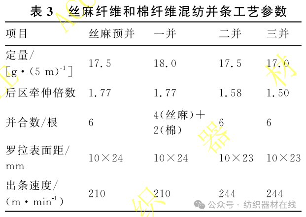 操控好丝麻纤维预并条和纯棉精梳条的质量,确保混纺比精确。因为丝麻纤维易呈现静电环绕问题,故相对湿度应偏大操控,约为65%,一起选用复合涂料胶辊。此外,丝麻纤维预并合工序应恰当加大后区牵伸倍数,以进步纤维伸直平行度。丝麻纤维和棉纤维混纺并条工艺参数见表3。