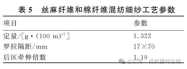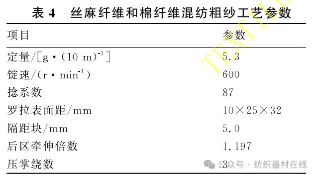 粗纱出产一般比较顺畅,重点是依据质猜中丝麻纤维与棉纤维的份额,优选粗纱捻系数。经过实验,优选粗纱捻系数为87,牵伸隔距、隔距块标准恰当偏大操控,以确保牵伸进程顺畅,条干杰出。丝麻纤维和棉纤维混纺粗纱工艺参数见表4。