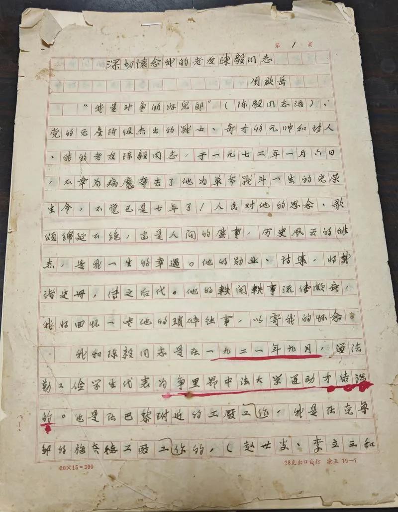 1979年10月周钦岳撰文《殷切思念我的老友陈毅》,回想留法勤工俭学阅历(巴南区档案收藏)