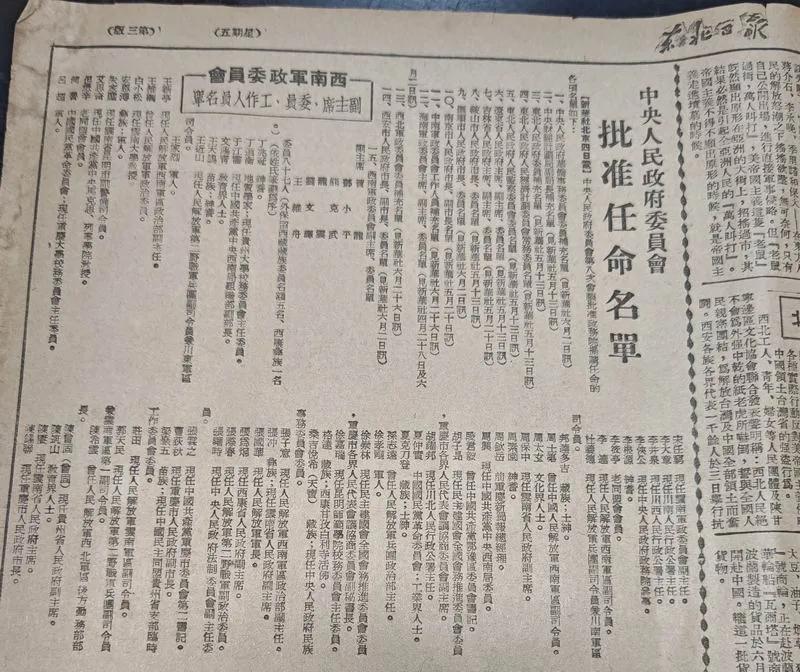 1950年《东北日报》刊载周钦岳任西南军政委员会委员的报导(巴南区档案收藏)